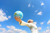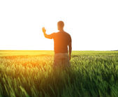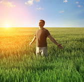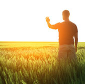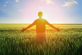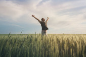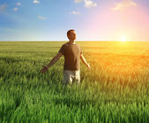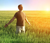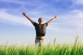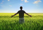Człowiek stojący na polu zielonym pod błękitne niebo