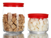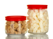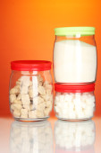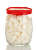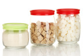 Słoiki z ryczałtu cukier biały i cukier biały kryształ na białym tle