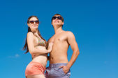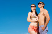 Para pobyt na plaży pod niebem z światło słoneczne.