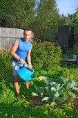 Dziewczyna uśmiecha się ogrodnik i chwastów marchwi na łóżku w cieplarniach