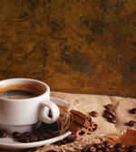 Młynek do kawy w stylu retro, filiżankę kawy na tle grange