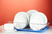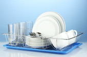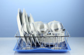 czyste naczynia na stojak na niebieskim tle
