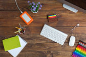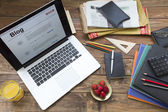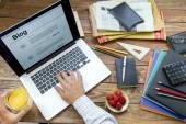 Osoba pracująca na komputerze w przytulny drewniany stół ciemny