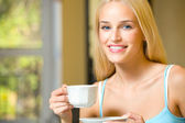 Szczęśliwa dziewczyna z czajnik i filiżanki, w domu