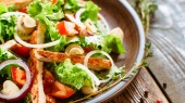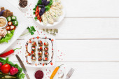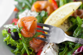Sałatka z łososiem jedzenia w restauracji widok z góry