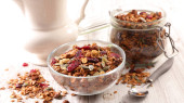 Zdrowe muesli z jagodami goji w szklanym słoiczku, zbliżenie