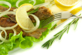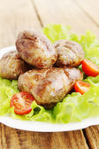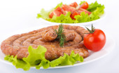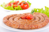Kiełbasa z mięsa wieprzowego i wołowego pomidory i przyprawy, sałatka jarzynowa