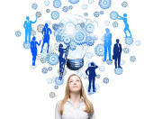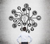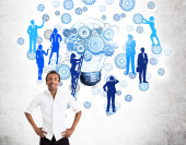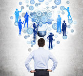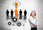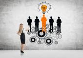 Koncepcja pracy zespołowej z przemyślaną bizneswoman i abstrakcyjny rysunek biegów, żarówka i sylwetki ludzi na drabinie. Tło ścian betonowych