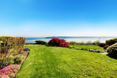 Widok na podwórko. Zielony trawnik i kwitnący niższe łóżka