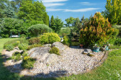 Zdjęcie "Widok na podwórko. Zielony trawnik i kwitnący niższe łóżka" może być wykorzystywane do celów osobistych i komercyjnych zgodnie z warunkami zakupionej licencji Royalty-free. Obraz jest dostępny do pobrania w jakości wysokiej rozdzielczości do 5760x3840.