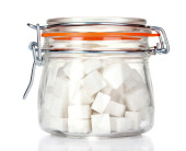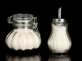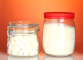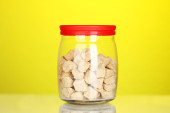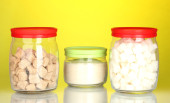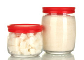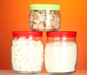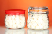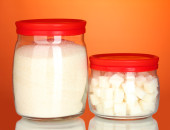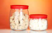 Słoiki z ryczałtu cukier biały i cukier biały kryształ na kolorowe tło