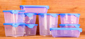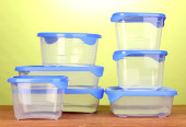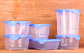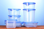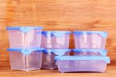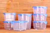 plastikowe pojemniki do żywności na drewniane tła