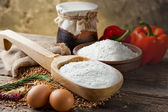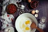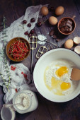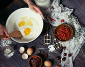 Składniki na owoce i ciasto czekoladowe w rustykalnej kuchni; sele