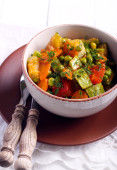 Zdjęcie "Diety wegetariańskie Sałatka z grillowanej cukinii, świeże pomidory, kukurydza i zioła w misce gliny na ciemnym tle drewnianych" może być wykorzystywane do celów osobistych i komercyjnych zgodnie z warunkami zakupionej licencji Royalty-free. Obraz jest dostępny do pobrania w jakości wysokiej rozdzielczości do 5760x3840.