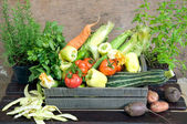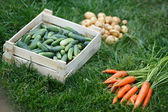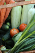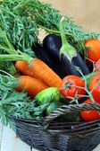 Świeże warzywa: marchew, cebulę, bakłażan, groszek, w wiklinowym koszu.