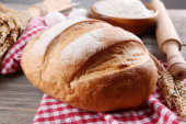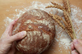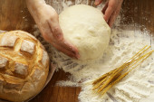 Ręce szefa kuchni z ciasta i domowe Naturalne organiczne chleba i mąki na podłoże drewniane