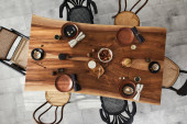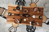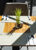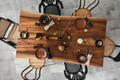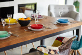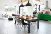 Nowoczesna jadalnia ze stołem. Mała głębokość pola