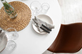 Zdjęcie "Nowoczesna jadalnia ze stołem. Mała głębokość pola" może być wykorzystywane do celów osobistych i komercyjnych zgodnie z warunkami zakupionej licencji Royalty-free. Obraz jest dostępny do pobrania w jakości wysokiej rozdzielczości do 5760x3840.