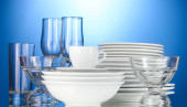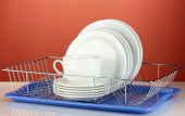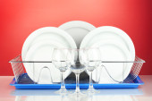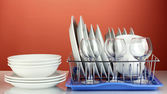 czyste naczynia na stojak na czerwonym tle