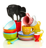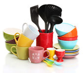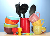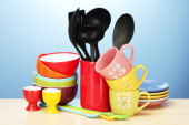 jasne puste miseczki, kubki i naczynia kuchenne na drewnianym stole na niebieskim tle