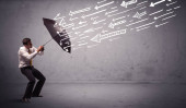 Biznes człowiek stojący z parasolem i wyciągnięte strzały uderzające go