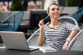 Zdjęcie "Pozytywne zachwycony kobieta siedzi przy stole" może być wykorzystywane do celów osobistych i komercyjnych zgodnie z warunkami zakupionej licencji Royalty-free. Obraz jest dostępny do pobrania w jakości wysokiej rozdzielczości do 5760x3840.
