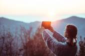 kobieta robi zdjęcie smartfonem o zachodzie słońca