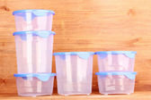 plastikowe pojemniki do żywności na drewniane tła