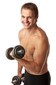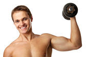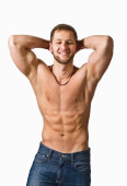 ładny uśmiechający się młody chłopak w dżinsy z nagi tors
