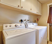 Stara pralnia z białymi szafkami i żółtymi ścianami.