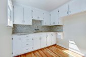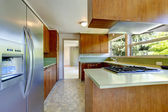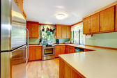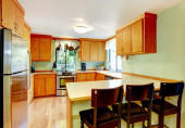 Jasna kuchnia z lekki brązowy szafki i blaty drewniane.