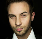 portret młody piękny człowiek modne przeciwko ogród letni.