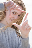 atrakcyjny uśmiechający się portret dziewczyny mieszanej rasy z serca ręką znak