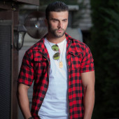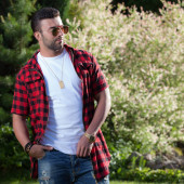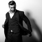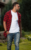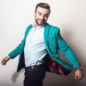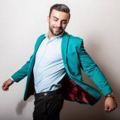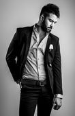 Sportowy przystojny mężczyzna w ubranie stanowi odkryty