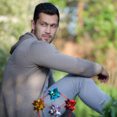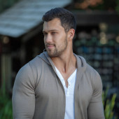 Sportowy przystojny mężczyzna w ubranie stanowi odkryty