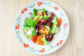 Świeże sałatki z pomidorów i oliwy z oliwek na powierzchni drewnianych.