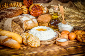 Asortyment pieczonego chleba na drewnianym tle stołu