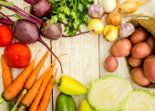Zdjęcie "Świeże warzywa na tle drewna. Miejsce dla tekstu. " może być wykorzystywane do celów osobistych i komercyjnych zgodnie z warunkami zakupionej licencji Royalty-free. Obraz jest dostępny do pobrania w jakości wysokiej rozdzielczości do 5760x3840.