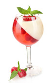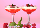 galaretka z owoców w okularach na drewnianym stole na różowym tle