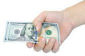 Ręka gospodarstwa banknotów dolarowych. Na białym tle