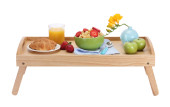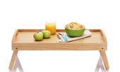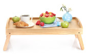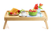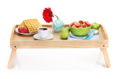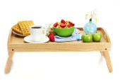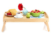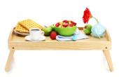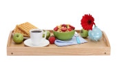 lekkie śniadanie na drewnianej tacy na białym tle