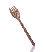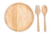 Widok z góry jasny drewnianą łyżką i widelcem na białym tle. Zapisane w