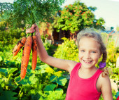 starsza kobieta we własnym ogrodzie z pęczek świeżej marchwi