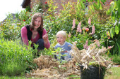 starsza kobieta w ogrodzie z małą córeczką zbieranie marchwi