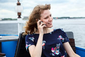 piękne kaukaski młoda kobieta w białej koszuli dzwonienie z telefonu komórkowego na stoliku kawiarnianym.