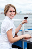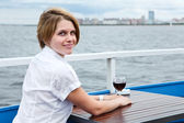 ładna kobieta w sukni z kieliszek do wina siedzi przy stole