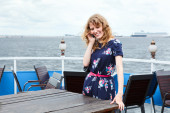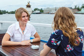 szczęśliwe kobiety stały na pokład statku w morze rejs