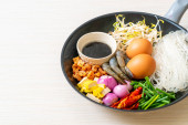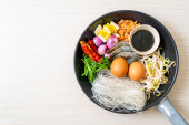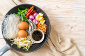 Zupa z owoców morza, makaron i warzyw w biały talerz