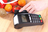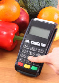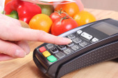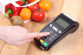 Terminal płatniczy z kartą kredytową, owocami i warzywami, płatność bezgotówkowy za zakupy