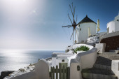 Wiatrak miasta Oia w słoneczny dzień, Santorini